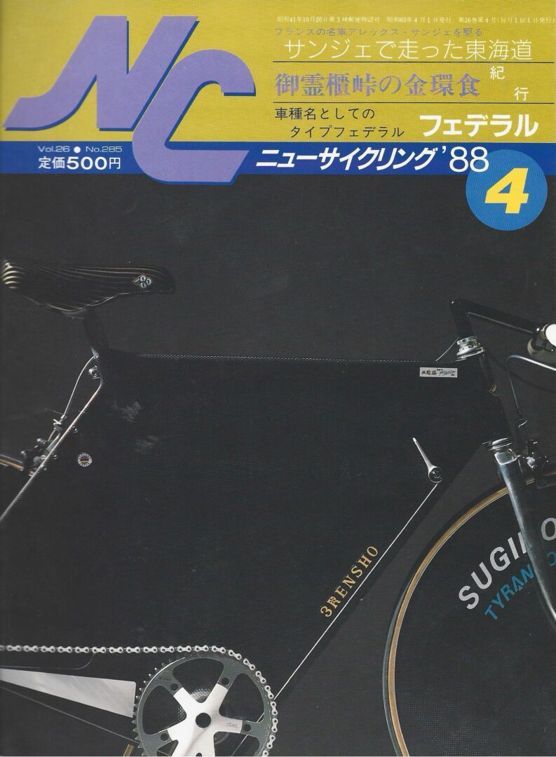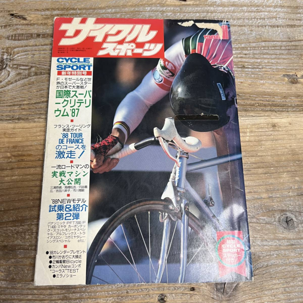 The article goes on to point out that this is a prototype, complaining that “rigidity in the vertical direction is too strong,” and suggesting that it could be improved by adding a cut out to the central part of the panel. Around the same time this article was published, the prototype was being displayed at the 1988 World Cycle Fair in Long Beach, California. The author goes on to say they look forward to a test ride, which will be written about in the February issue. I don’t have a copy of that review, but in April 1988, a complete Carbo-Panel made the cover of the Japanese cycling magazine “New Cycling“: