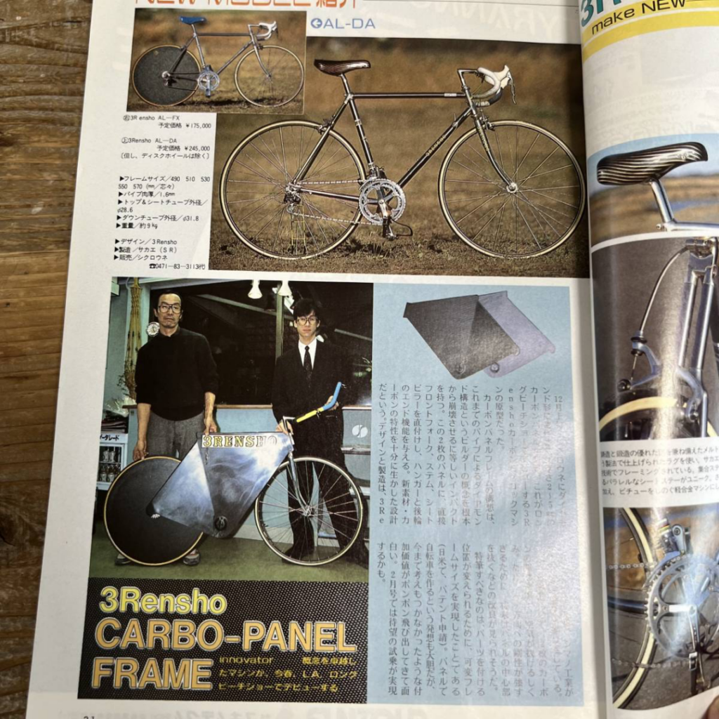 A few years ago, I came across this scan from the January 1988 issue of “Cycle Sports,” a Japanese cycling magazine. Within a longer article about 3Rensho aluminum road bikes is a feature on a prototype carbon frame called the “Carbo-Panel.” Designed by 3Rensho and manufactured in partnership with Nikko Sangyo and Shimano, it featured a unique design consisting of two carbon panels (2-5mm thick) that form the frame of the bike.